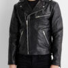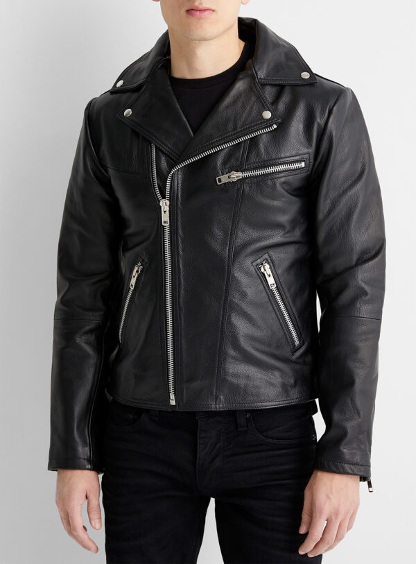 An authentic biker jacket made from genuine pebbled leather with silver hardware, double point collar with snap buttons, and asymmetric metallic zip.
