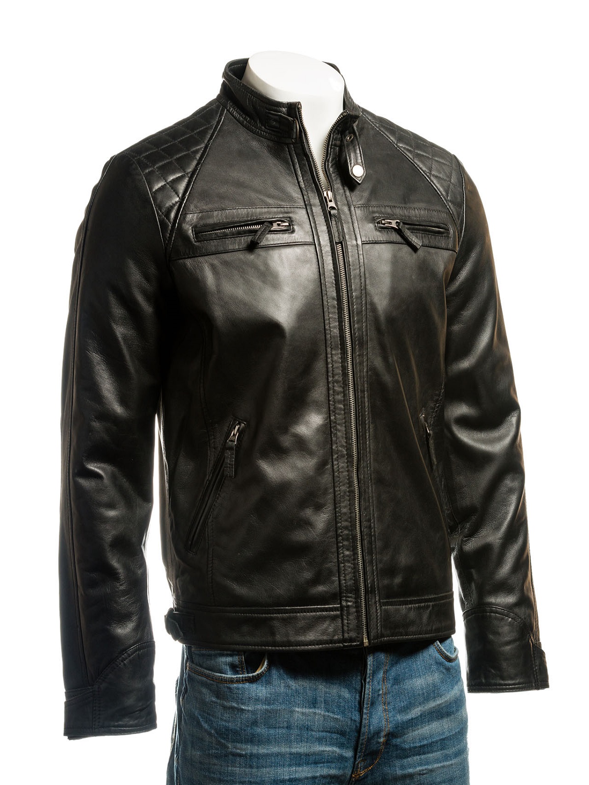 This men’s black leather jacket has a sleek vibe. Highly recommended!