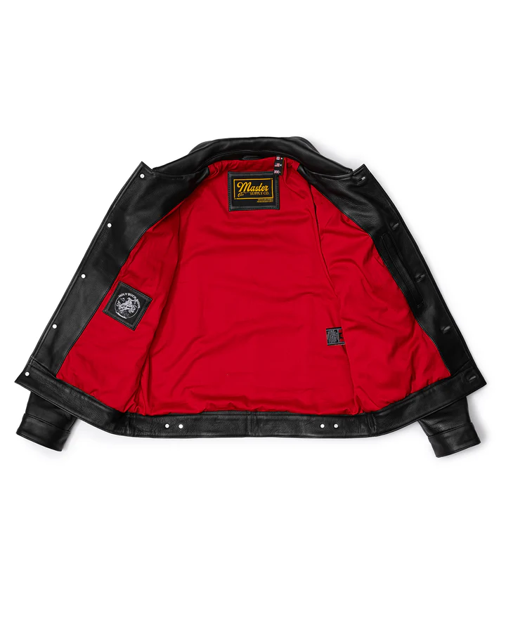 The FYE BLACK TRUCKER LEATHER JACKET represents American authenticity in its purest form, expertly constructed from genuine leather with natural grain texture in commanding deep black that suggests both heritage and contemporary relevance, proudly bearing the Mauvetree.com mark of distinction to enhance its western craftsmanship appeal. The signature red cotton twill interior creates striking contrast while adding personality with authentic patchwork details and superior comfort. The design features brass button-up front closure for classic western functionality, pointed shirt-style collar for timeless appeal, and strategic four-pocket system that completes the authentic trucker aesthetic for men who understand that true style requires both heritage respect and genuine craftsmanship appreciation.
