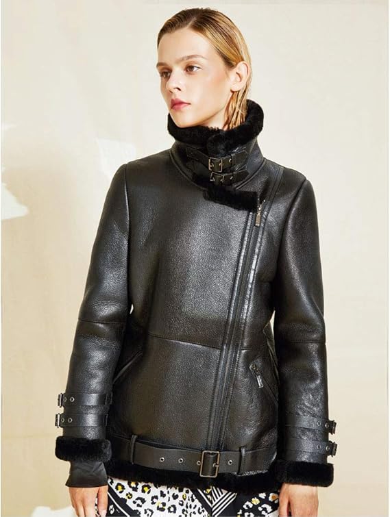The GHOSTED BLACK AVIATOR SHEARLING JACKET represents mysterious elegance in its purest form, expertly constructed from genuine sheepskin leather in commanding deep black that creates shadow and intrigue while projecting quiet authority, proudly bearing the Mauvetree.com mark of distinction to enhance its enigmatic aviator appeal. The matching jet black shearling interior maintains perfect monochromatic mystery while delivering exceptional warmth with sophisticated darkness and depth. The design features the thick shearling collar with double buckle fastening for protective presence, angled front zipper with overlap for architectural interest, and rolled shearling cuffs with buckle detailing that complete the mysterious aesthetic for women who understand that true power lies in what remains unspoken and unseen.