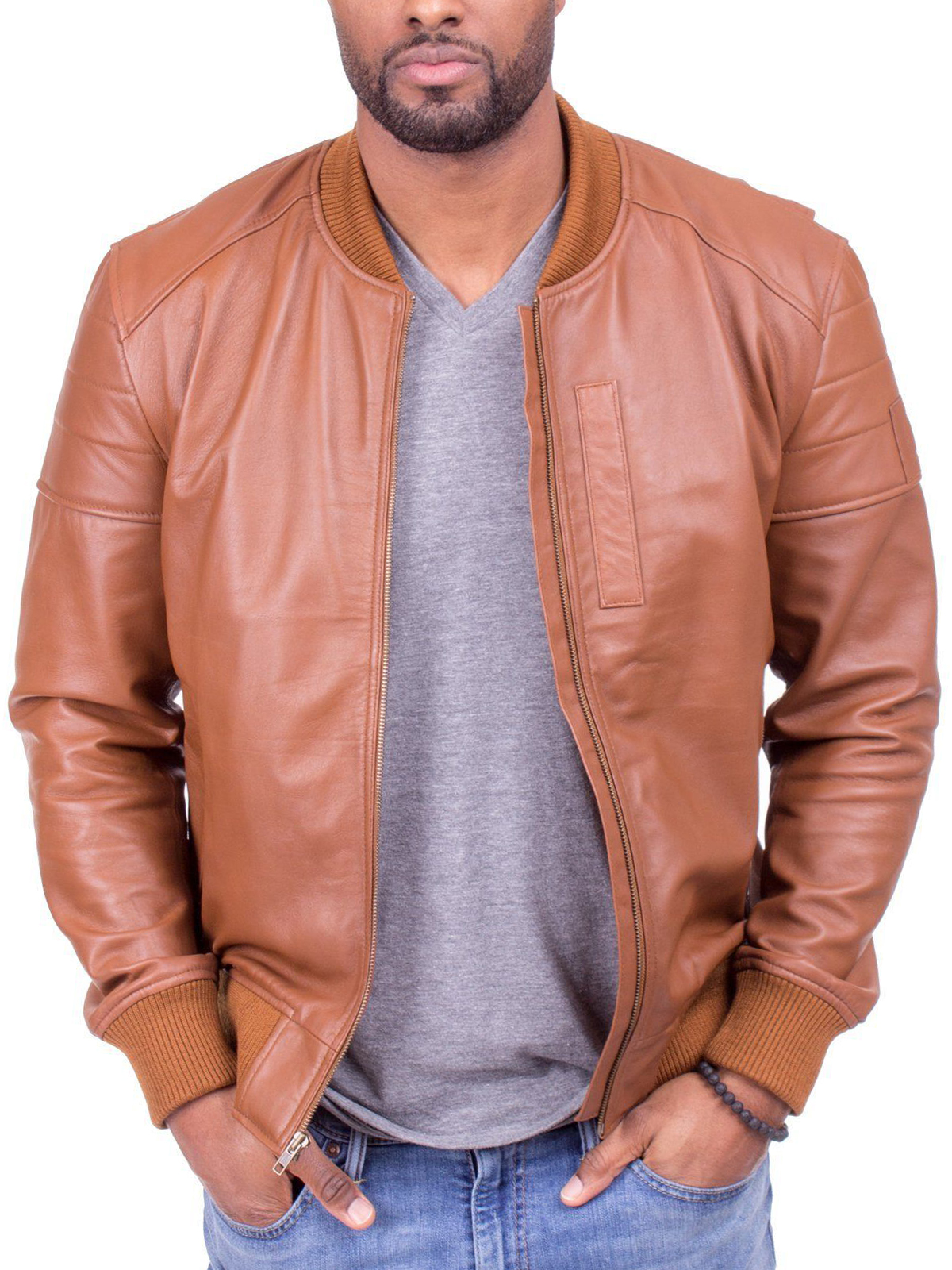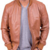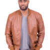The Men Camel Color Lambskin Leather Bomber Jacket with long sleeves and rib knit cuffs is a versatile fashion choice which you can wear on any occasion.