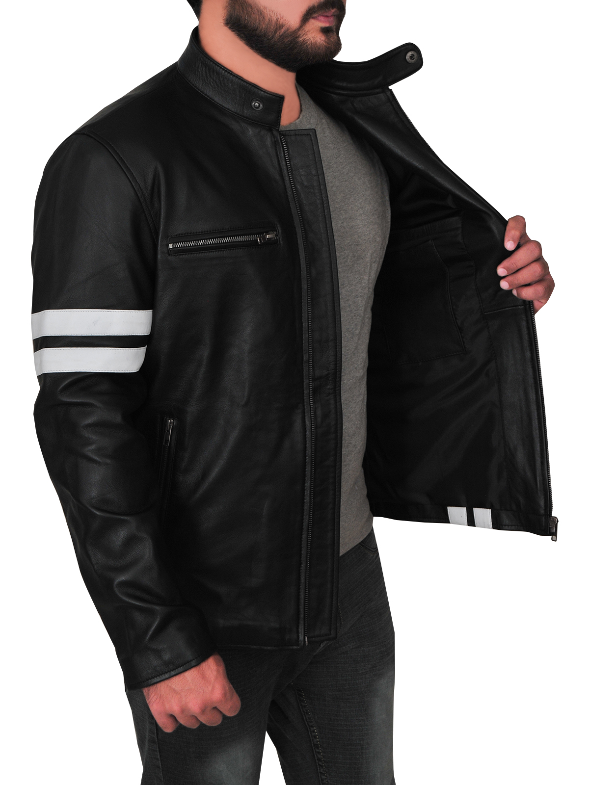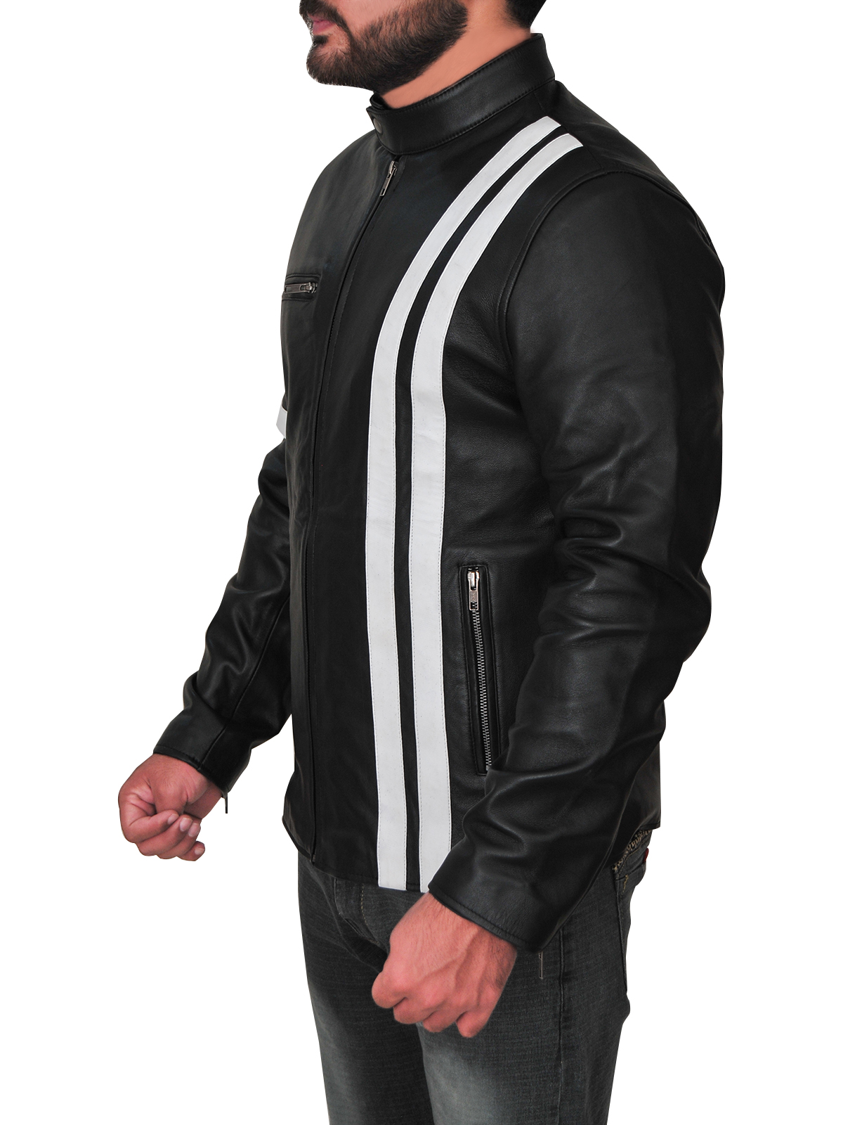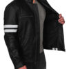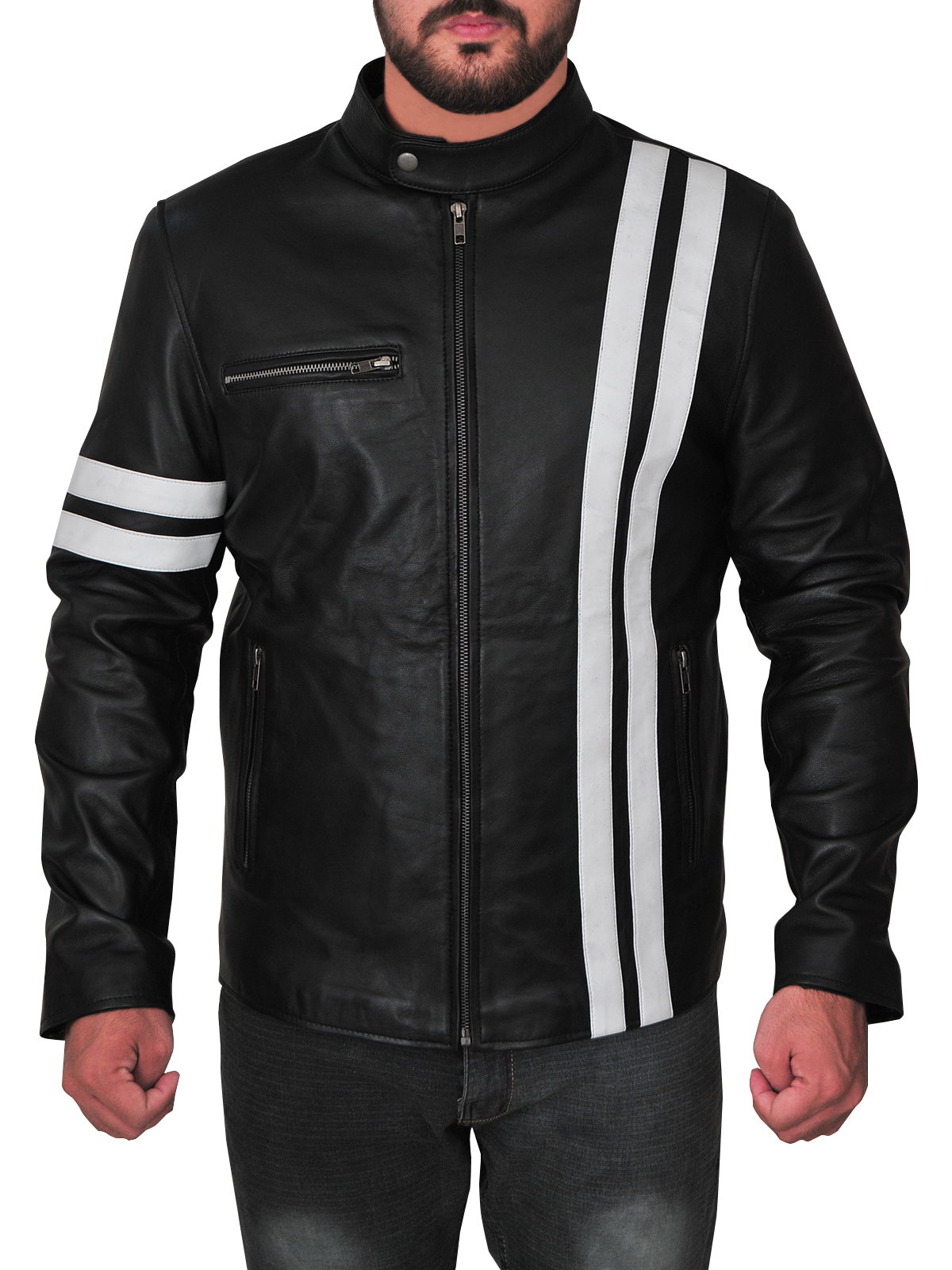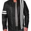 This sleek leather jacket is trending in men?s outerwear. With slim fit design and white stripes, this is the jacket which will make you look fresh and young. Fashion influencers are wearing this jacket with simple black or white tees. ?This Black Driver Leather Jacket is unique because of its body fitted stitching and eye catching stripes. Back in the days, stripes leather jackets were quite famous, you have seen Wolverine wearing one and mostly drivers and bikers embraced this look.