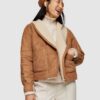 Slip into the excellency of this soft brown faux shearling leather jacket this fall. Its smooth texture and high strength will keep you warm.